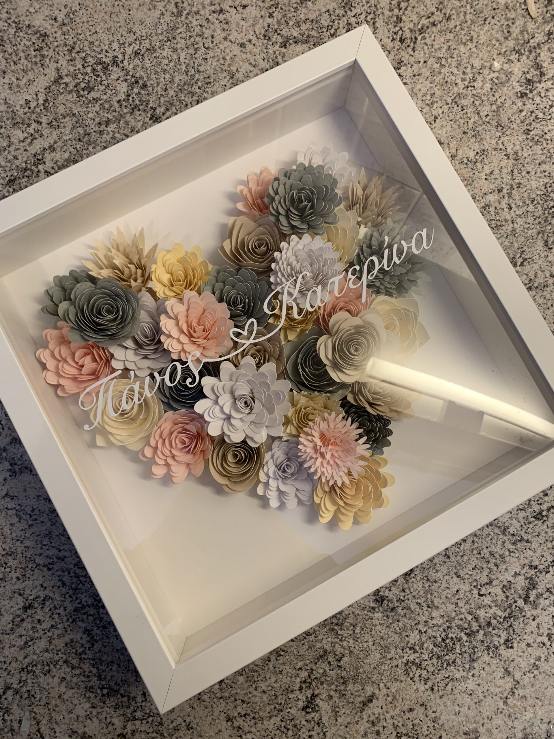 Tρισδιάστατο καδράκι, με λουλούδια απο άριστης ποιότητας σκληρό χαρτόνι. Το κάδρο είναι επιτραπέζιο και επιτοίχιο. Ένα ιδιαίτερο προσωποποιημένο δώρο για όλες τις περιστάσεις.