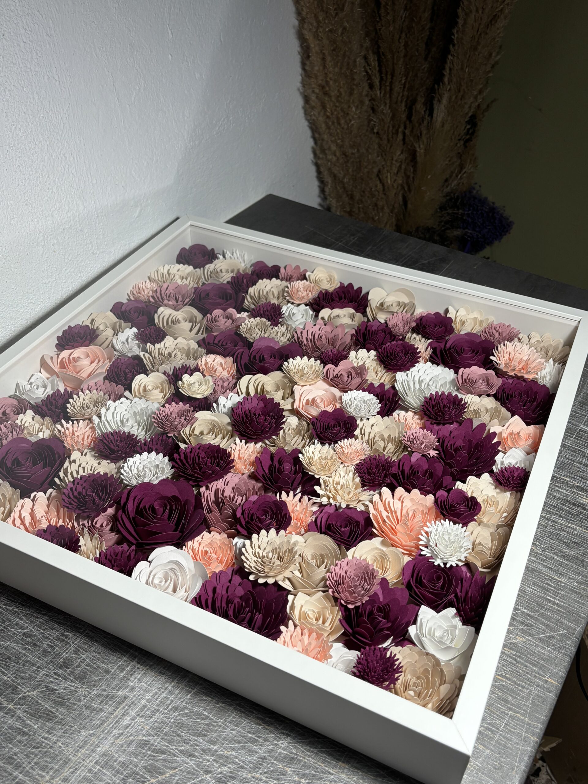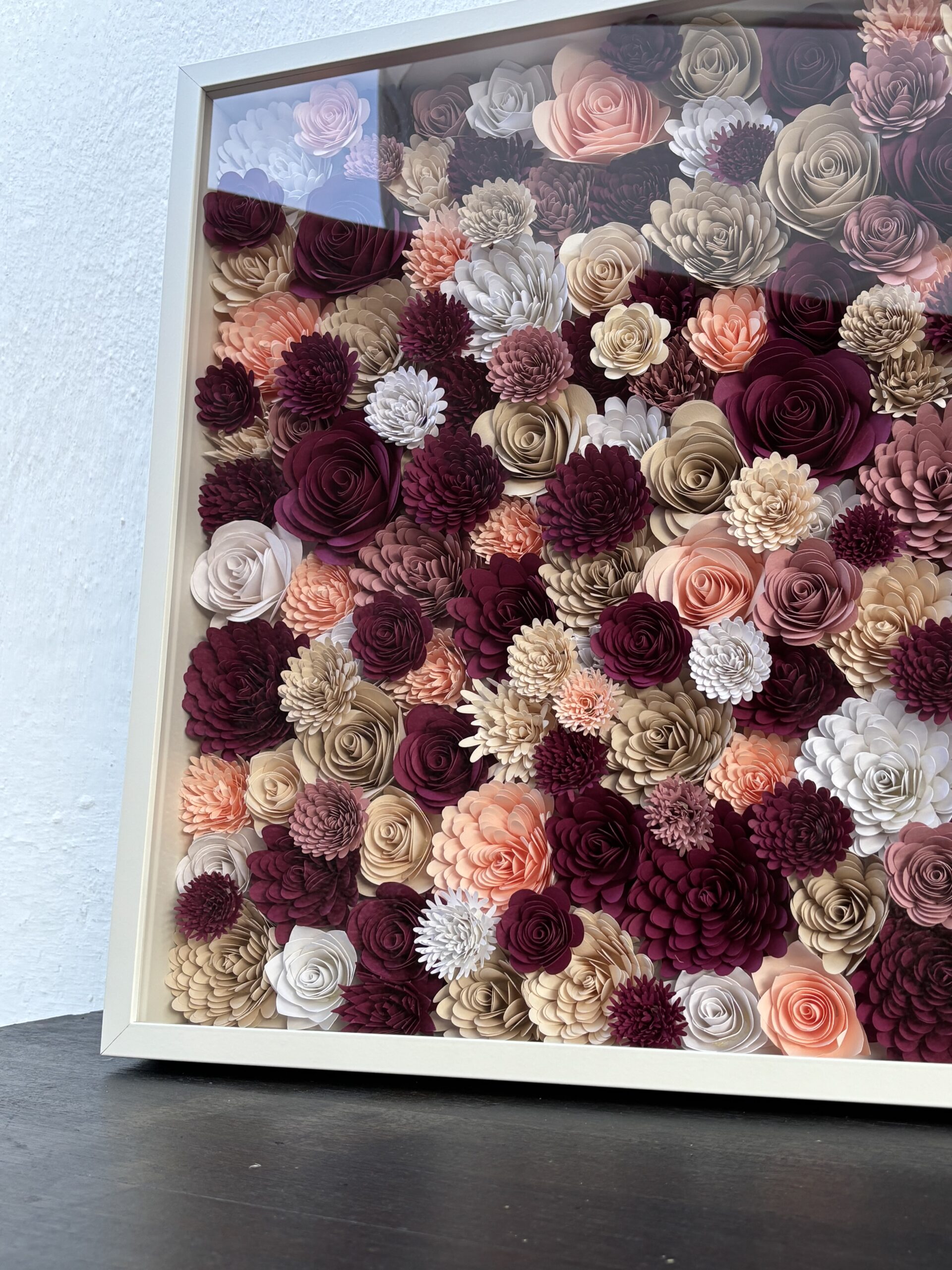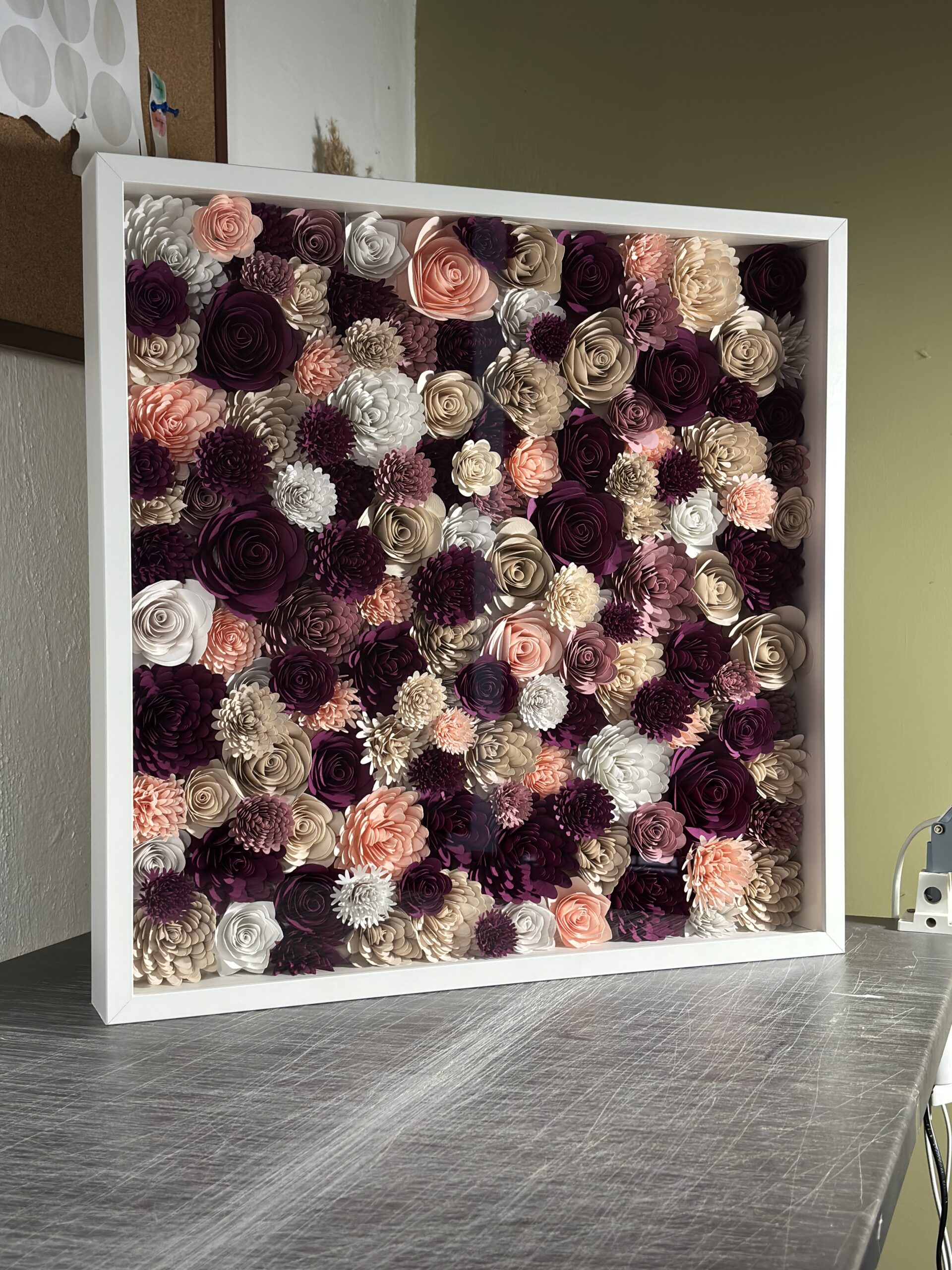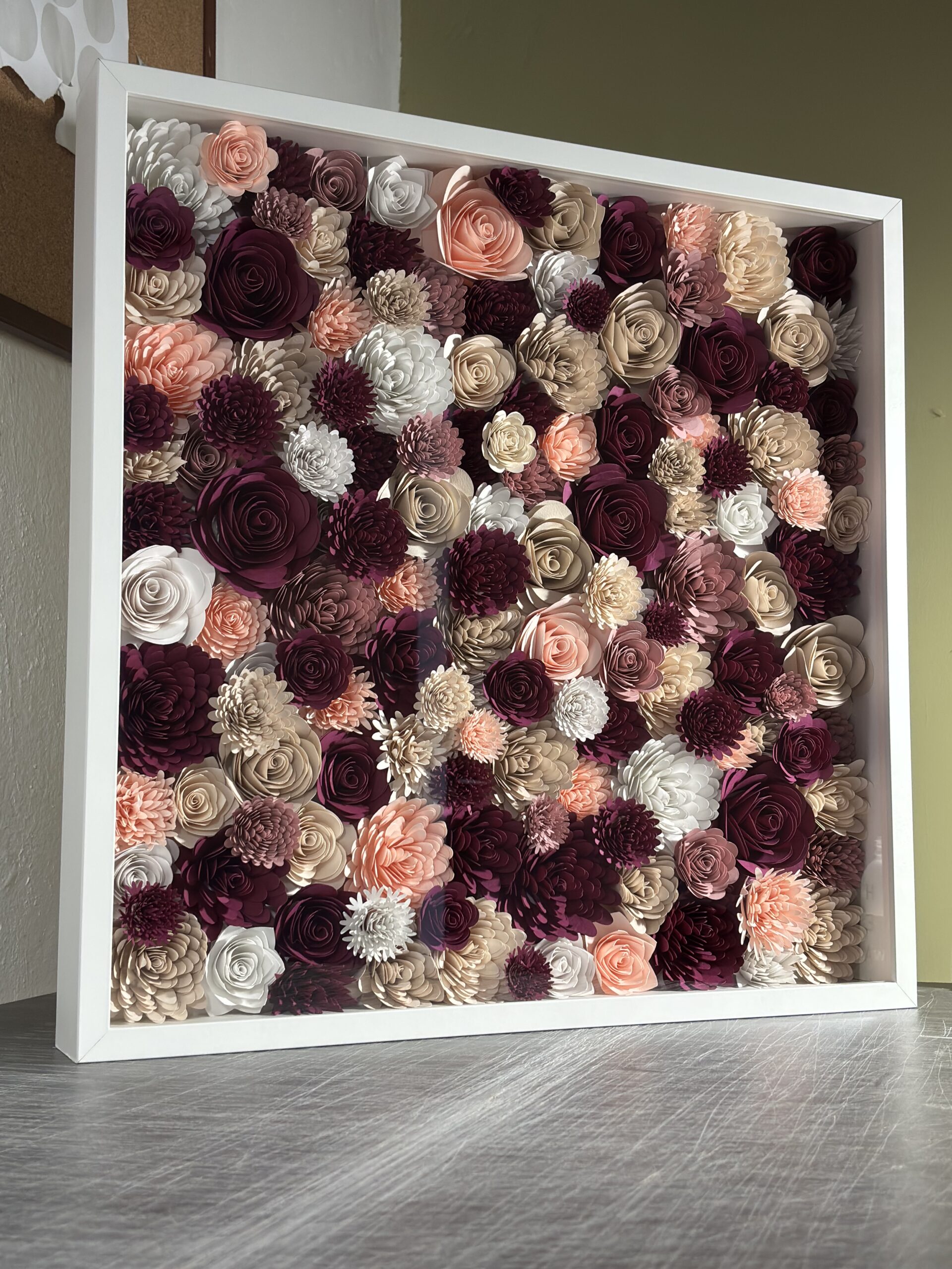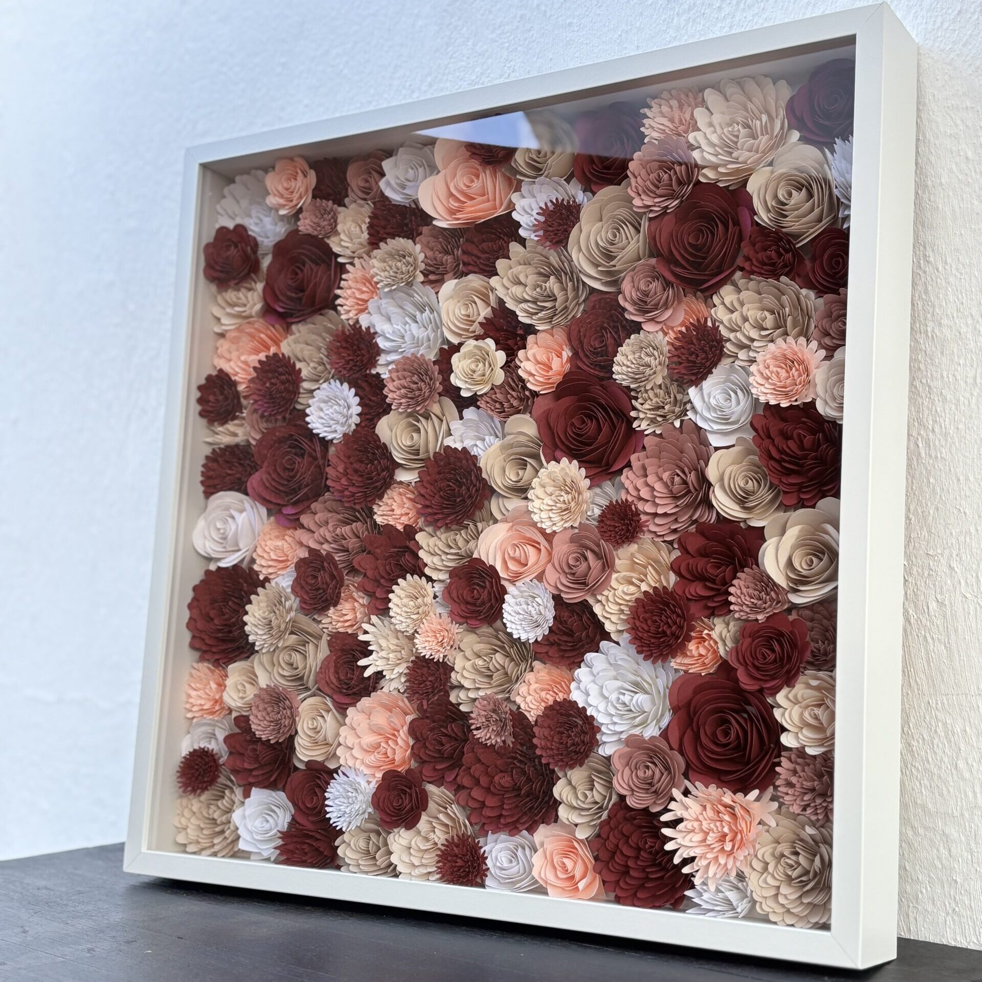 Κάδρο 50χ50, με λουλούδια σε διάφορες αποχρώσεις και πινελιές απο μπορντώ , από άριστης ποιότητας σκληρό χαρτόνι. . Το κάδρο είναι επιτοίχιο. Ένας προσωποποιημένος κήπος τέχνης.