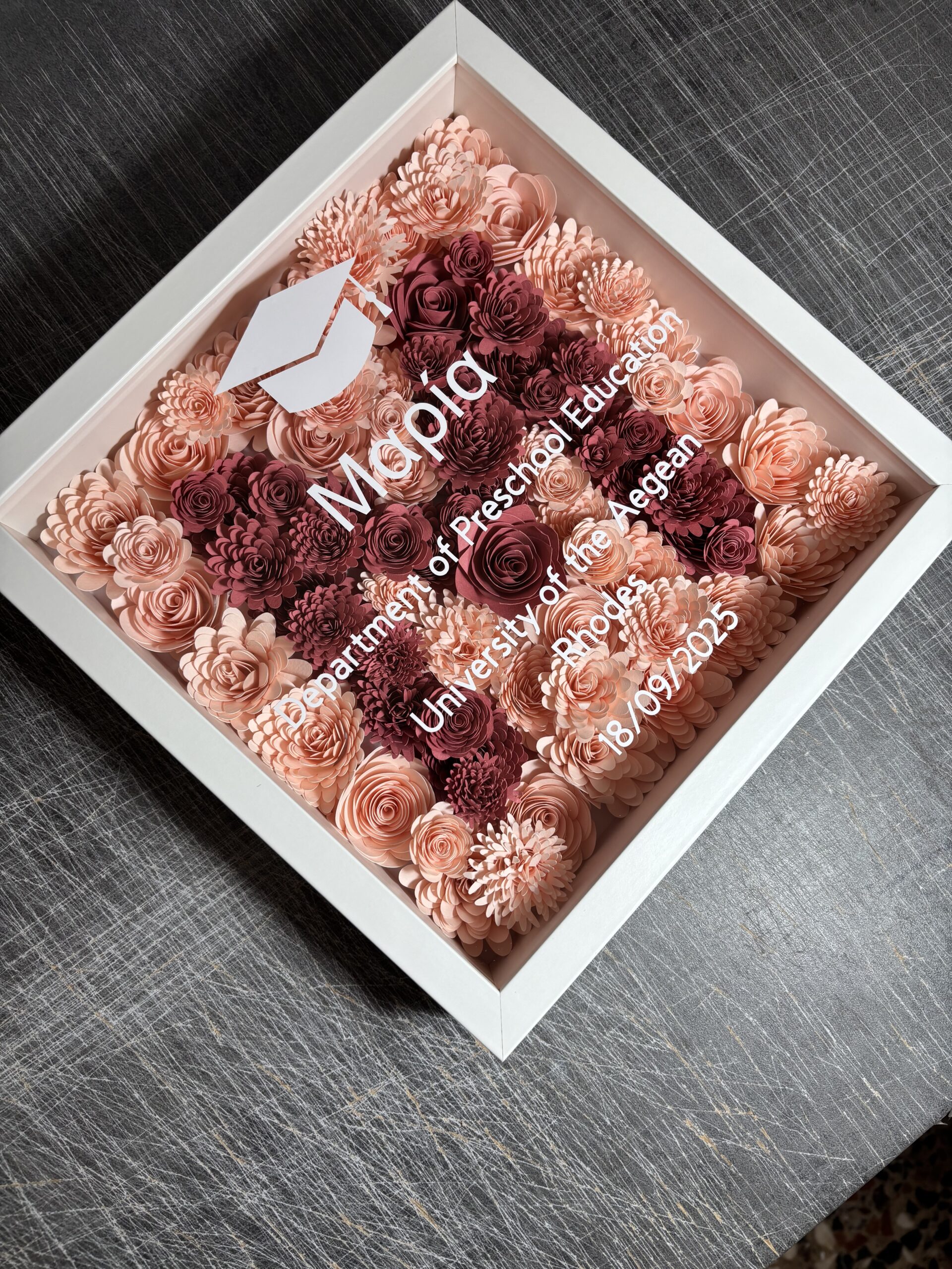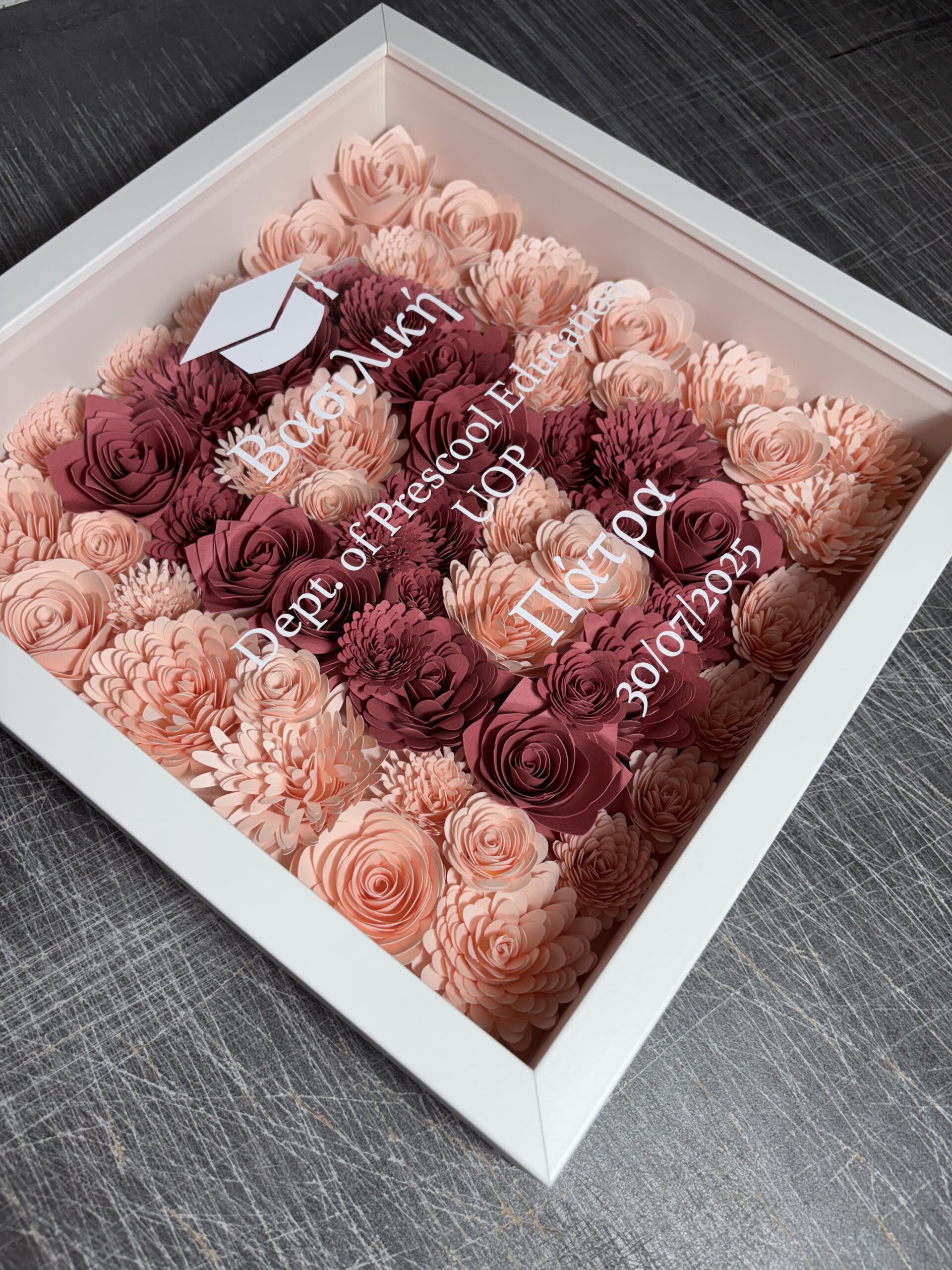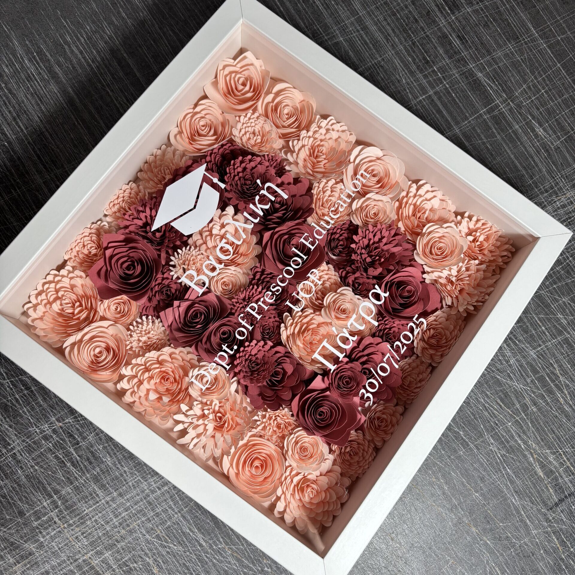 Tρισδιάστατο καδράκι, με εσωτερικό μονόγραμμα απο λουλούδια! Το κάδρο είναι επιτραπέζιο και επιτοίχιο. Ένα ιδιαίτερο προσωποποιημένο δώρο για όλες τις περιστάσεις.
